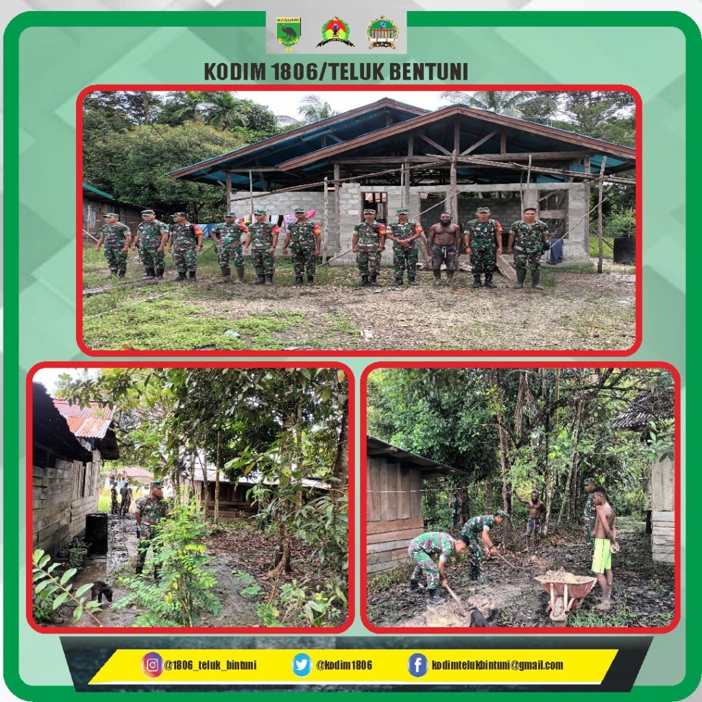 Personel Koramil Persiapan Aroba melaksanakan kegiatan karya bakti di Bapak Dersen dan Bapak Beny Susure di kampung Air terjun Distrik Aroba Kab. Teluk Bintuni.