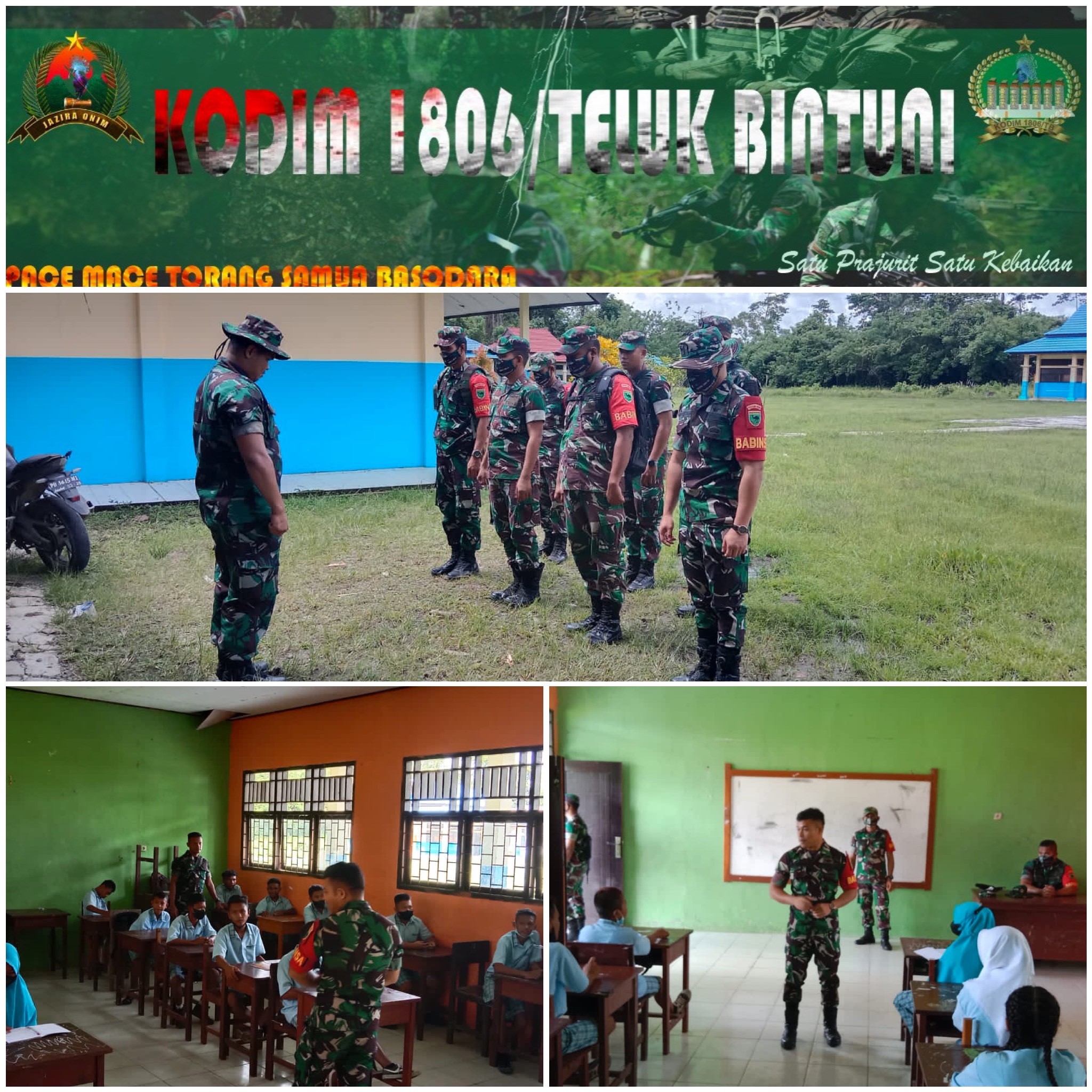 bertempat di SMP PERINTIS KORANO JAYA jalur 2 sp 2 kp Korano Jaya, Babinsa Koramil Persiapan Manimeri melaksankan Giat Bela Negara dengan siswa Smp Perintis guna memberikan pemahaman dasar kepada siswa SMP Peintis Distrik Manimeri.