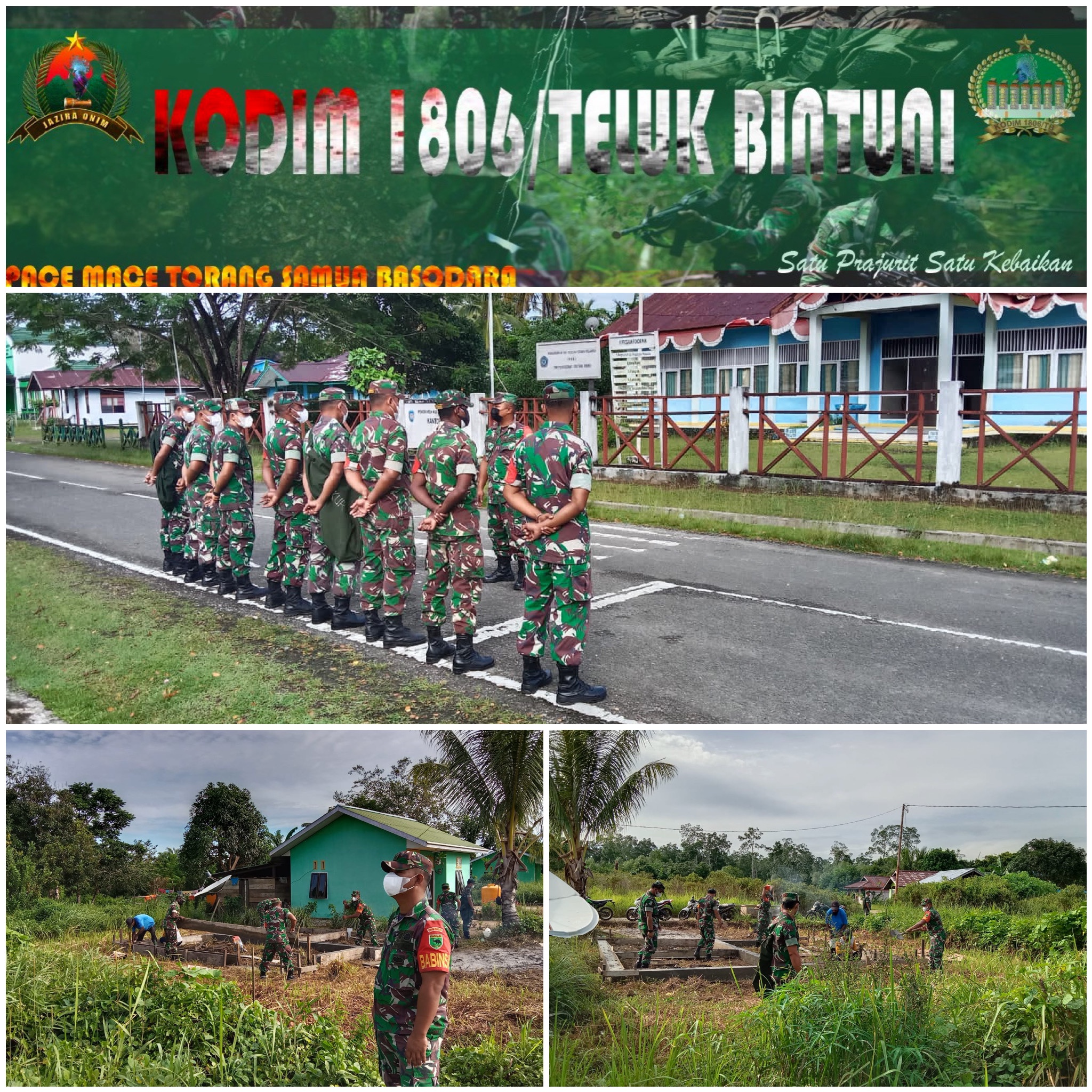 9 Orang Anggota Koramil 1806-02/Babo dipimpin Danramil Lerda Inf Djeki Rafael Lasol melaksanakan Karya Bhakti membantu pembangunan rumah Ibu Siti Fiawe dikampung Nusei Distrik Babo Kabupaten Teluk Bintuni.