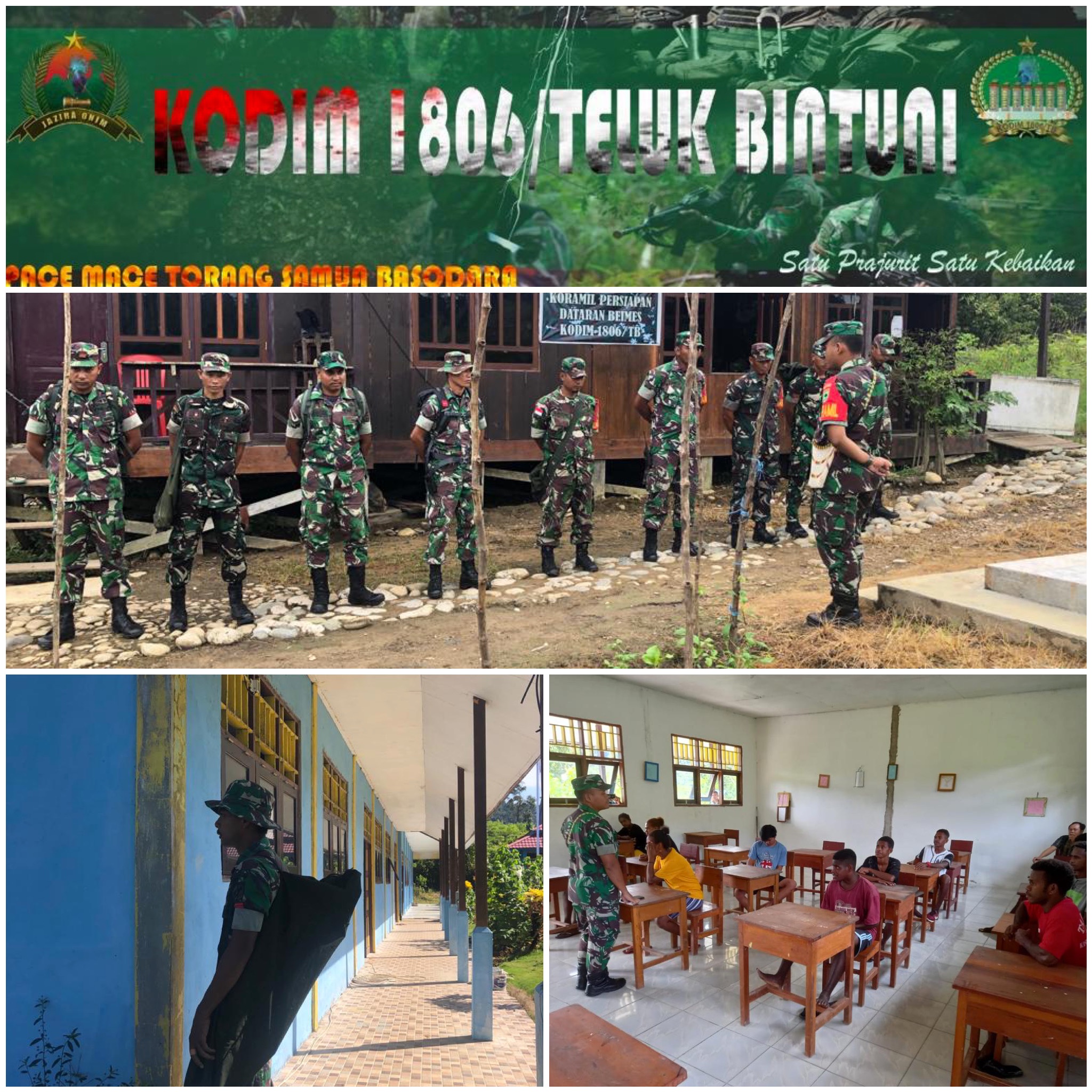 10 personil Koramil persiapan Dataran Beimes dilimpin Letda Chk M.Taqwim melaksanakan kegiatan Wasbang dan pemberian alat tulis kepada siswa/siswi SMP Inpress Horna Distrik Dataran Beimes