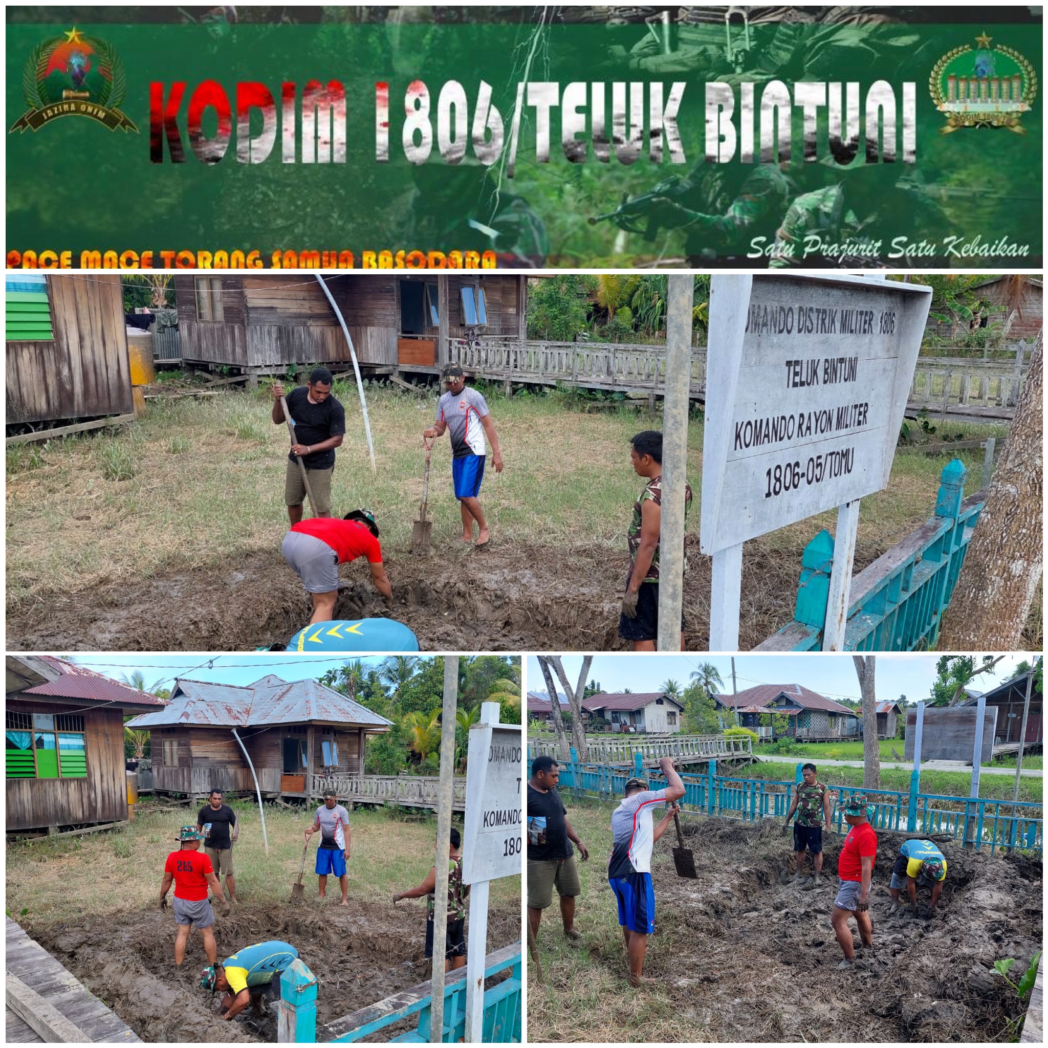 bertempat di Halaman Kantor koramil anggota koramil 05-/Tomu melaksanakan kegiatan pembenahan pangkalan sekaligus pembuatan kolam ikan .
