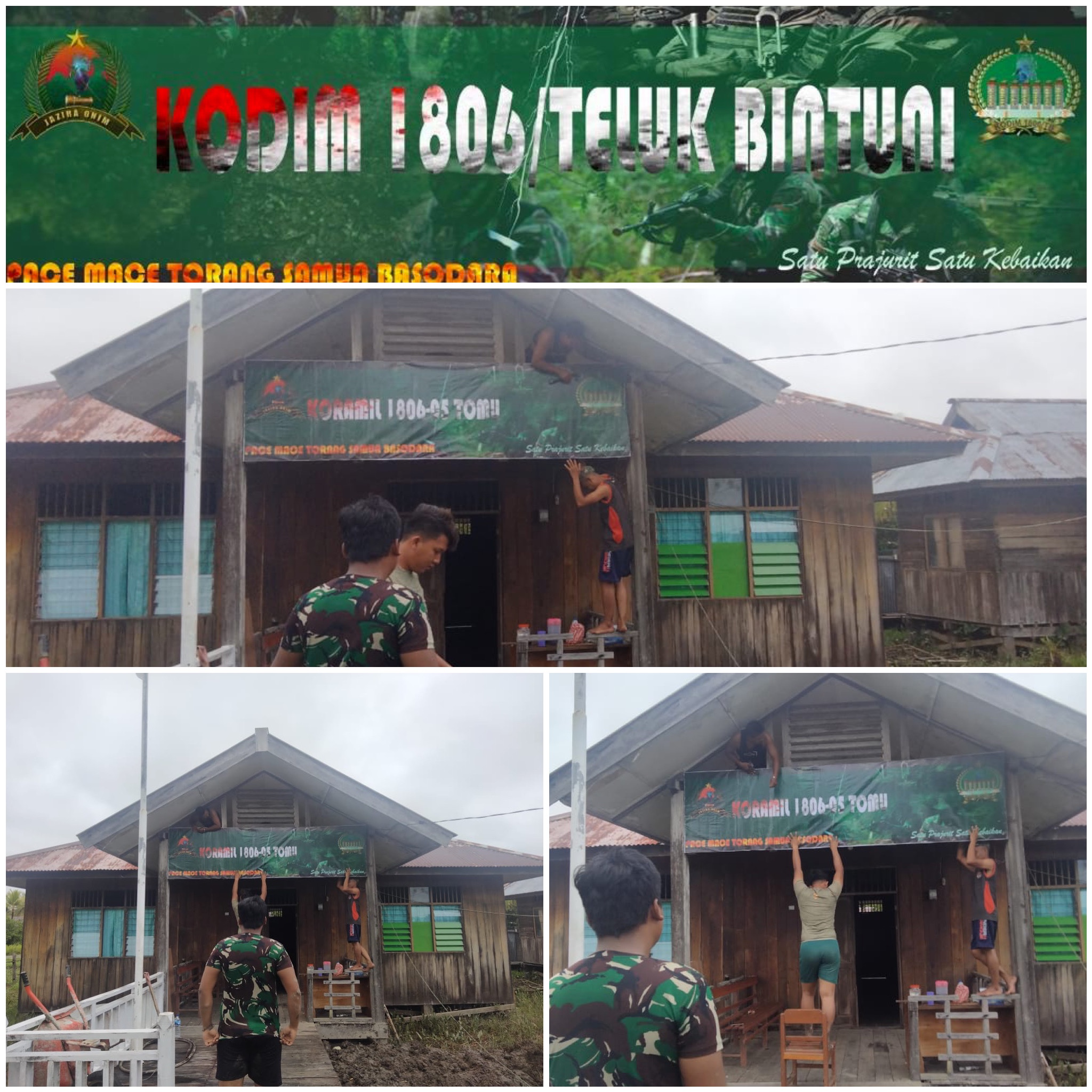 Anggota Koramil 1806-05/Tomu melaksanakan pembenahan pangkalan pemasangan Spanduk koramil 05/Tomu Kampung Wanagir Distrik Tomu Kab.Teluk Bintuni.