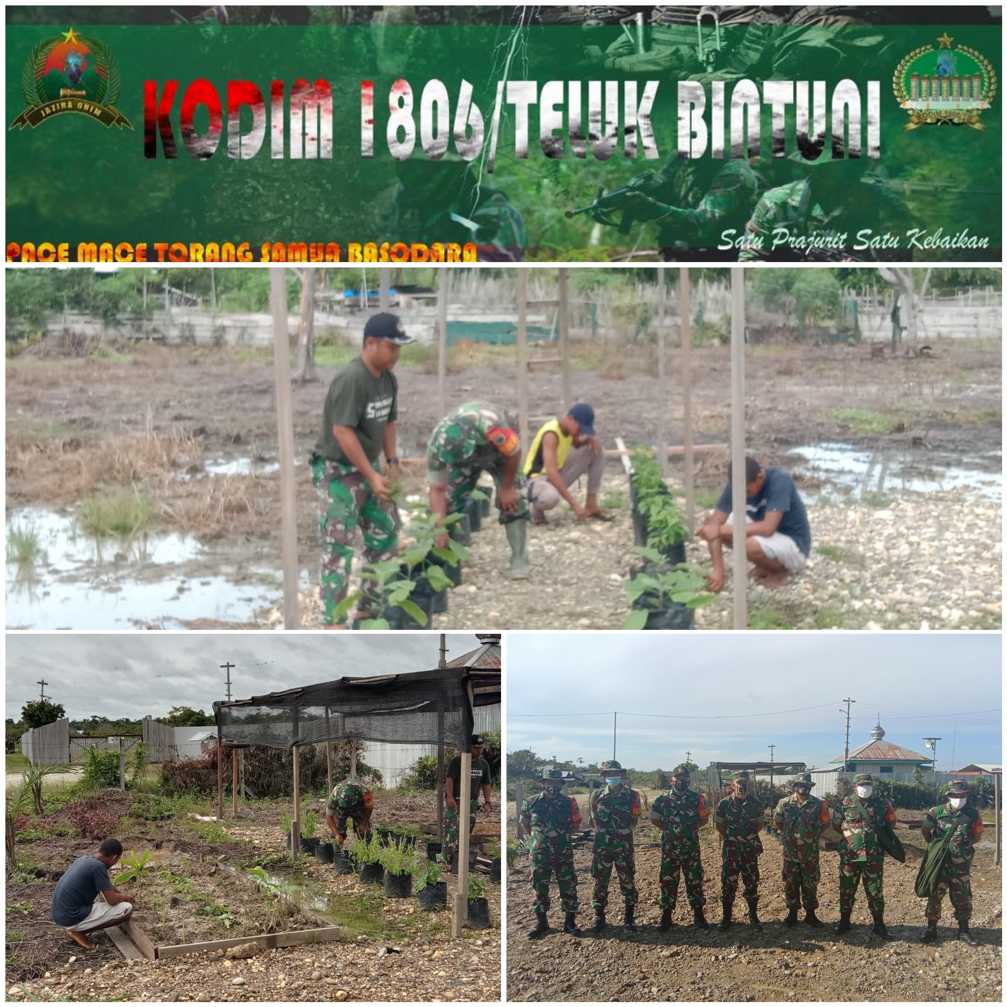 bertempat di halaman Makoramil 06/Meyado Meyado 6 0rang anggota Babinsa Koramil 06/ Meyado dipimpin Sertu Rusman melaksanakan kegiatan Ketahanan pangan dengan melaksanakan pembersihan rumput pada kebun Koramil 06/ Meyado.