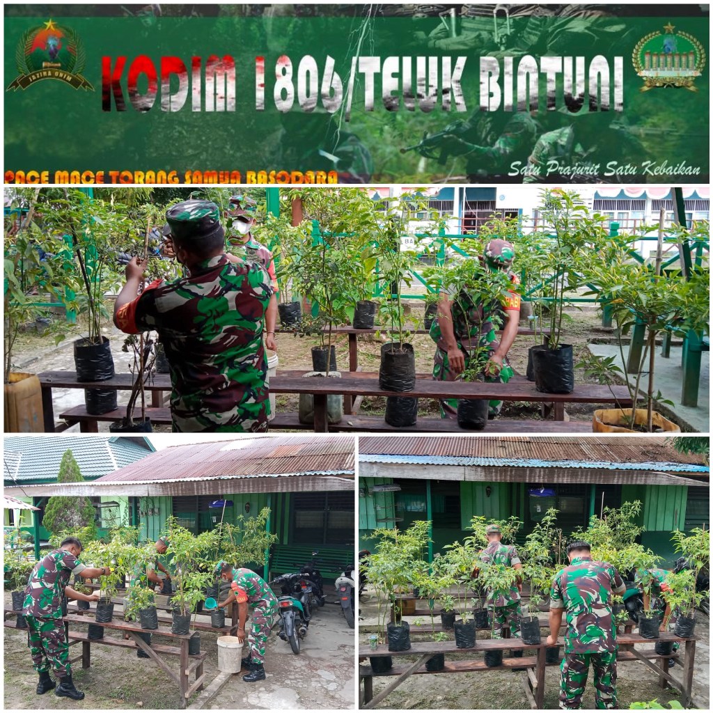 Anggota Koramil 1806-02/Babo dipimpin Serma Sitorus melaksanakan han pangan dihalaman Koramil 1806-02/Babo Distrik Babo,Kabupaten Teluk Bintuni.
