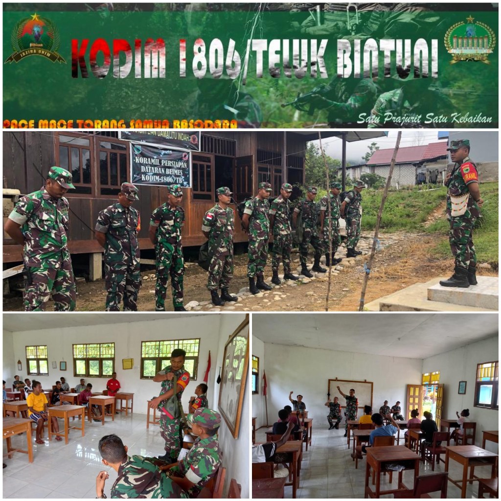 10 personil Koramil persiapan Dataran Beimes dipimpin Letda Chk M.Taqwim melaksanakan kegiatan Wasbang dan pemberian alat tulis kepada siswa/i SMP Inpress Horna Distrik Dataran Beimes