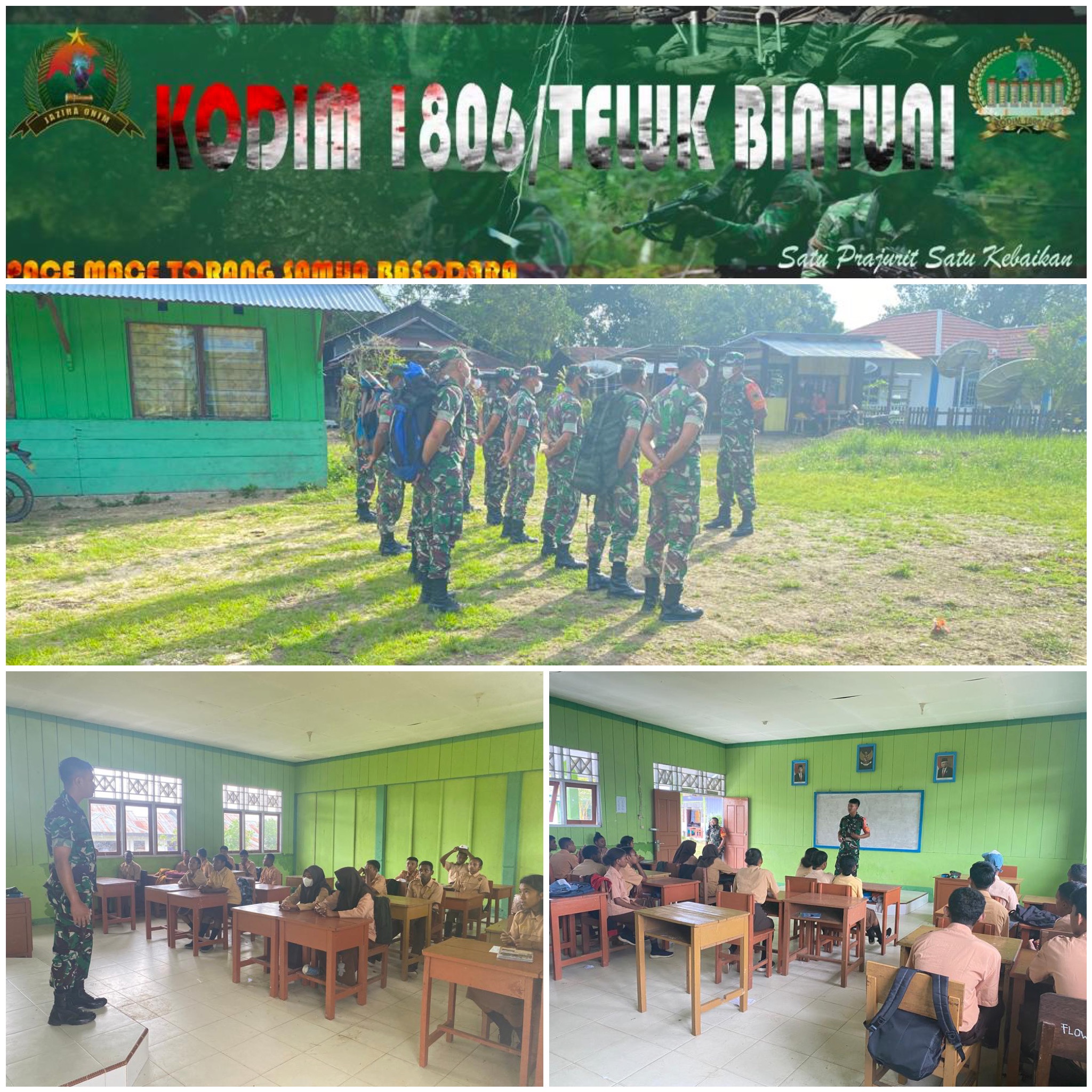 personil Koramil persiapan Sumuri dioimpin Sertu Ari melaksanakan kegiatan wasbang mengenai sejarah daerah papua di SMA tofoi di Kp Tofoi Distrik Sumuri Kab.Teluk Bintuni.