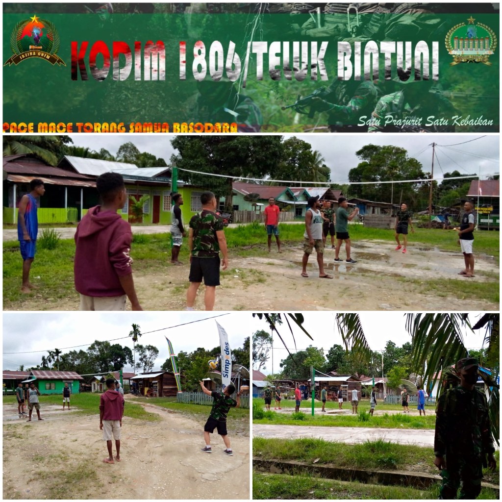 personil Koramil persiapan Sumuri Letda inf.Joni Bernat Siby melaksanakan kegiatan olahraga bersama masyarakat, di Kampung tofoi Distrik Sumuri Kab.Teluk Bintuni.