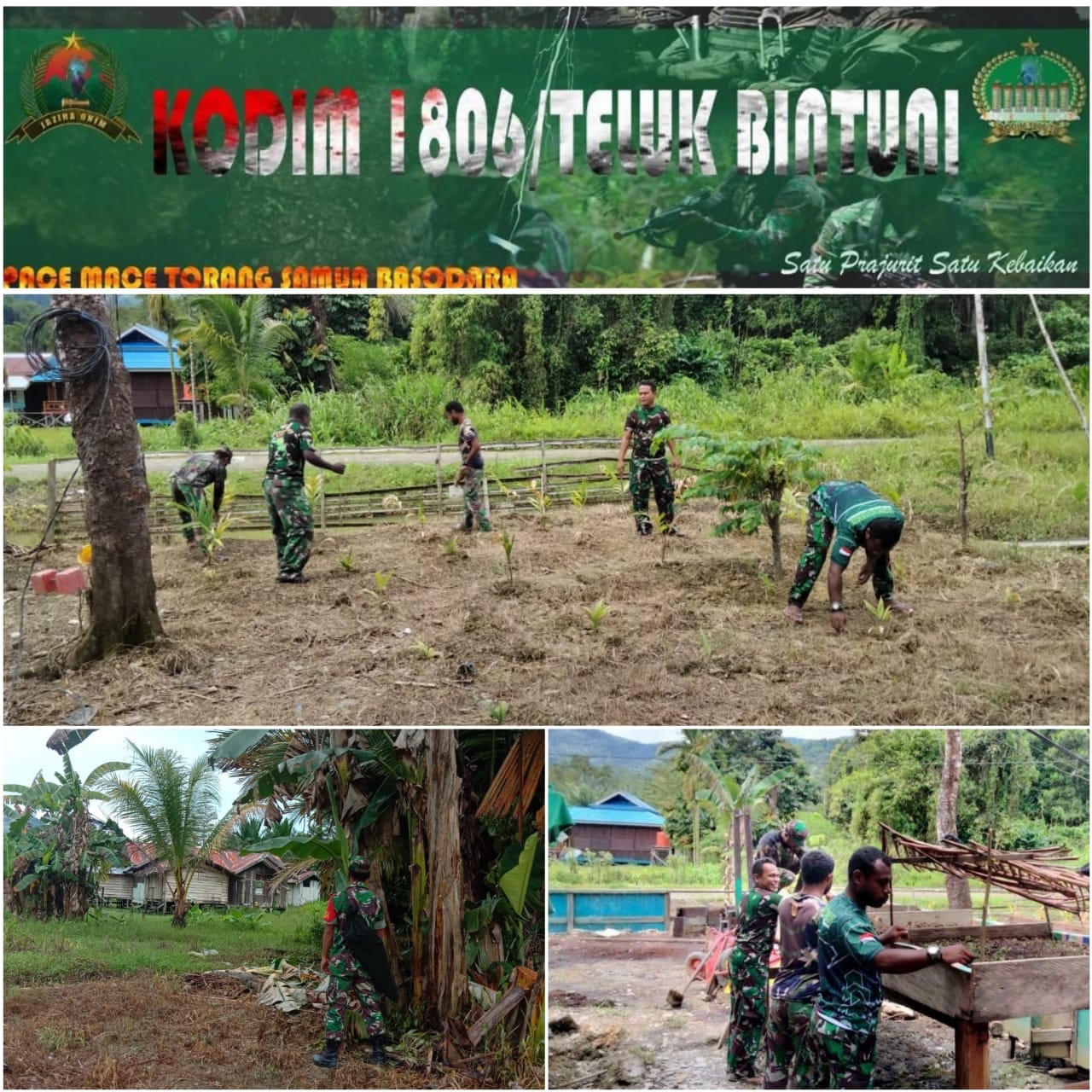 Anggota Koramil 1806-04/Wamesa di pimpin Sertu Welem Y Mobilala Melaksanakan ketahanan pangan di Koramil, Pembersihan lahan sekaligus penanaman bibit sawi dihalaman Koramil 04/Wamesa