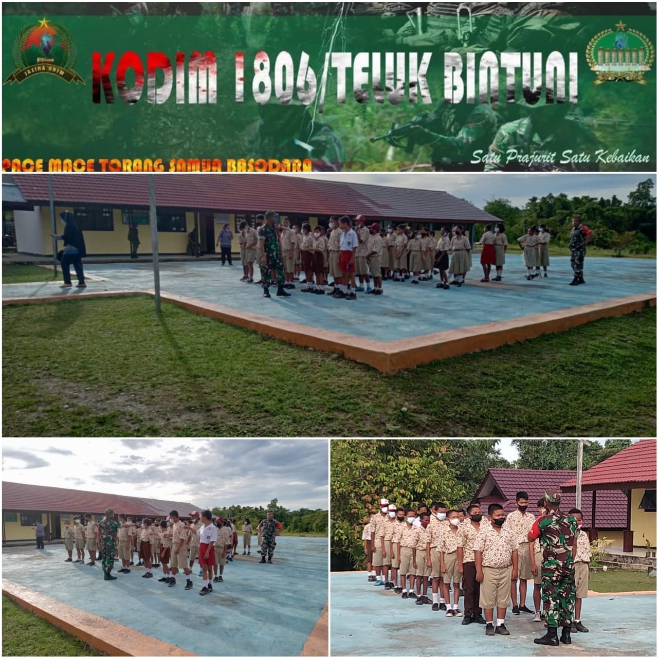 10 Orang Babinsa Koramil Persiapan Manimeri di pimpin Sertu Ghazali melaksanakan kegiatan Wawasan Kebangsaan dengan memberikan materi Pbb di SD Perintis Manimeri bertempat di jalan Bumisaniari Sp.3 Jalur 7 Distrik Manimeri Kabupaten Teluk Bintuni.