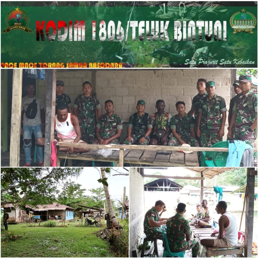 10 Orang Personel Koramil Persiapan Aroba melaksanakan kegiatan Komunikasi Sosial di Rumah Bpk Yosep Kambia pemilik hak Ulayat. di Kampung Wame Distrik Aroba Kabupaten Teluk Bintuni, guna mendapatkan lahan Pembangunan Koramil Persiapan Aroba, di pimpin Serda Robi Sunata.