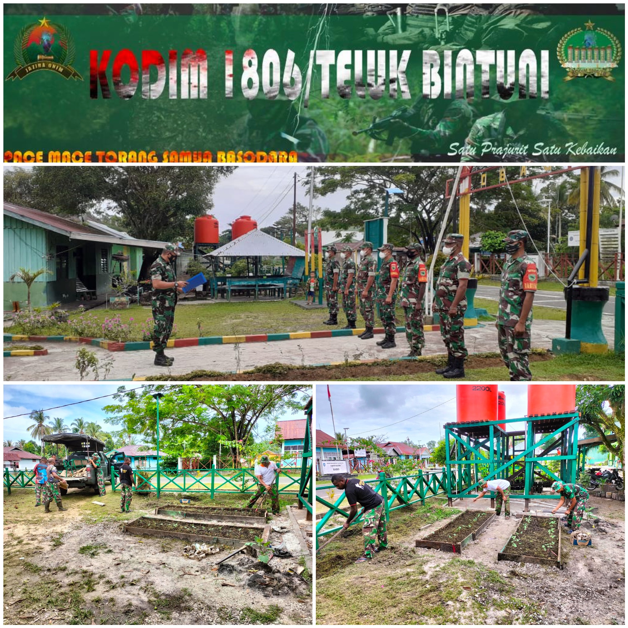 Anggota Koramil 1806-02/Babo dipimpin Serma Sitorus melaksanakan ketahanan pangan dihalaman Koramil 02 Babo Distrik Babo,Kabupaten Teluk Bintuni.