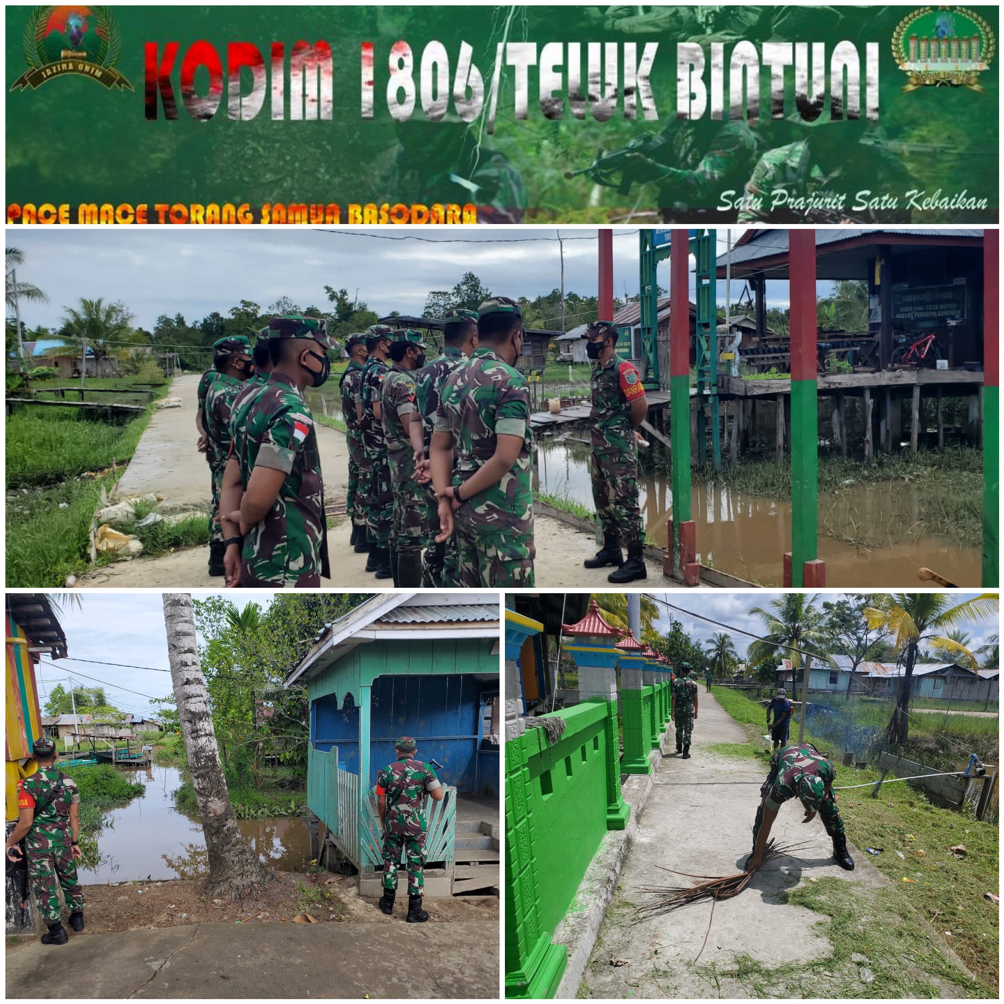 Personel Koramil Persiapan Kamundan melaksanakan kegiatan Karya Bakti membantu pembersihan sektor mesjid Kamundan distrik Kamundan dengan