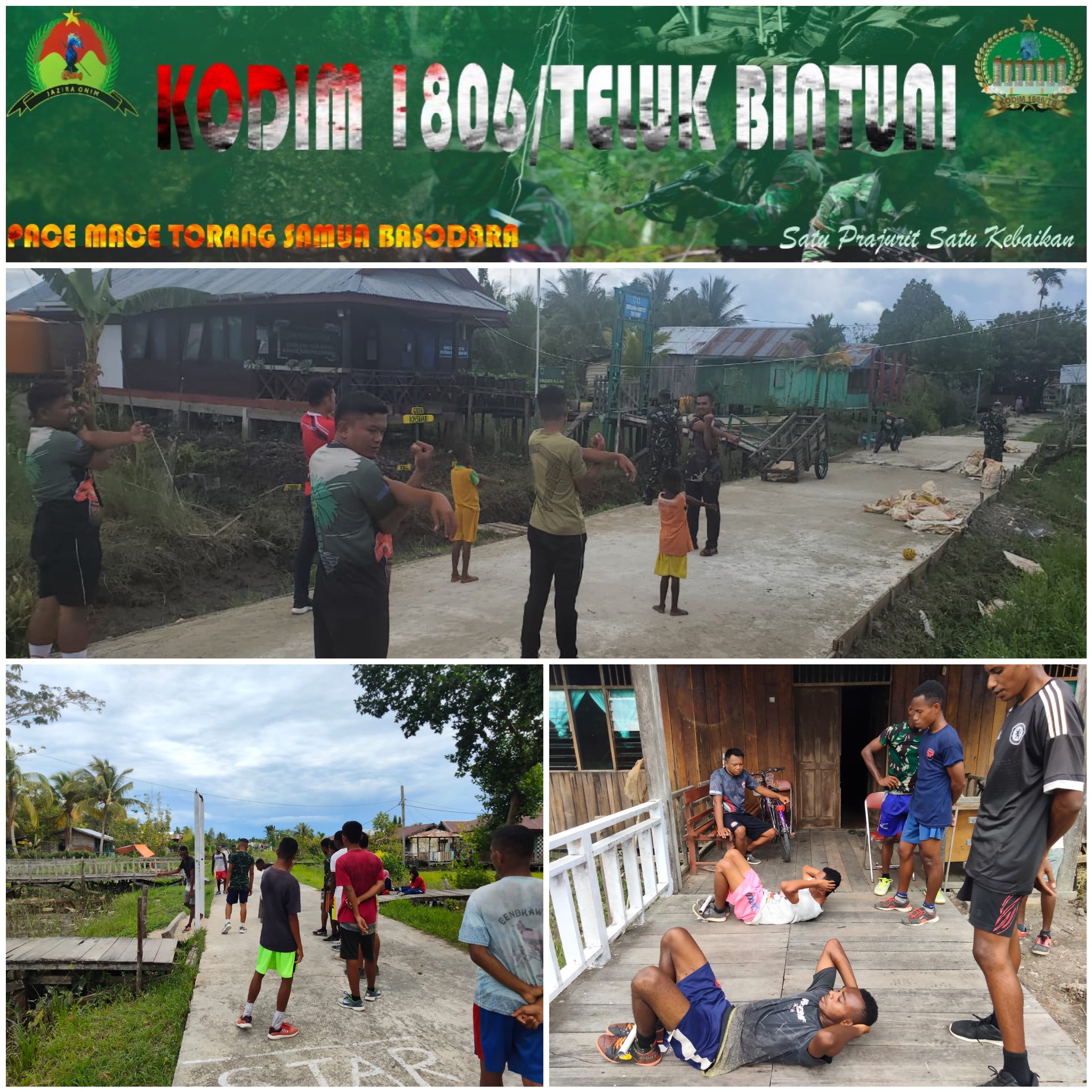 Anggota Koramil 05/Tomu melaksanakan kegiatan pembinaan putra putri calon prajurit tni- ad di halaman Koramil kampung wanagir distrik tomu,Kabupaten Teluk Bintuni.