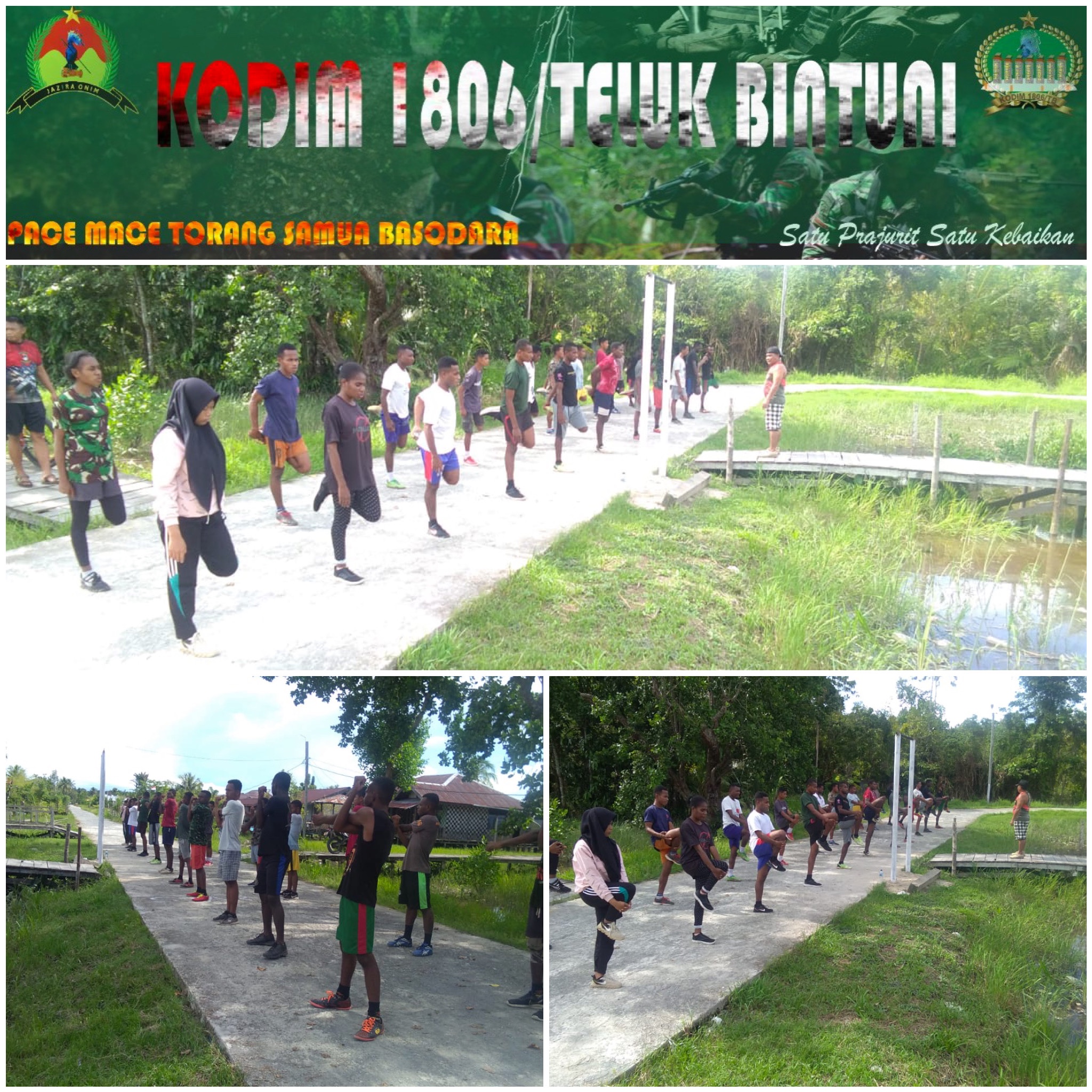 pers Anggota melaksanakan kegiatan Pembinaan putra putri calon prajurit di sekitar Koramil 1806-05/Tomu kp.wanagir distrik tomu ,Kabupaten Teluk Bintuni.