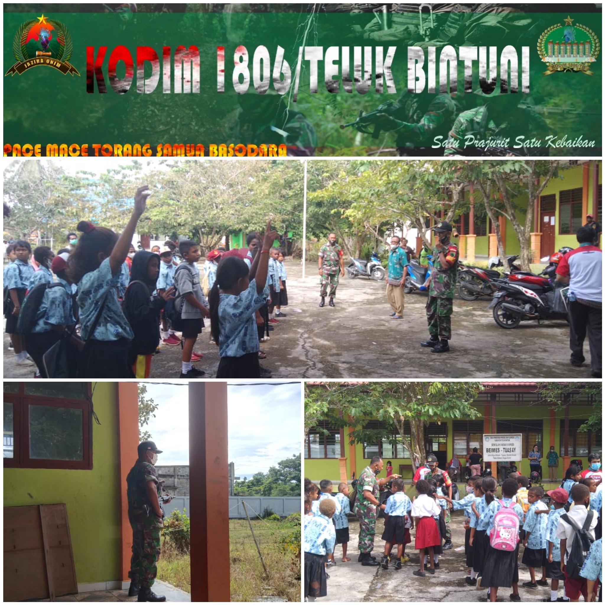 Bertempat Di SD YPK Beimes Kp Tuasai Distrik Bintuni,Babinsa Koramil 1806-01/Bintuni, Sertu Samran Bersama anggota melaksanakan Kegiatan Wasbang dan Sosialisasi Vaksinasi.