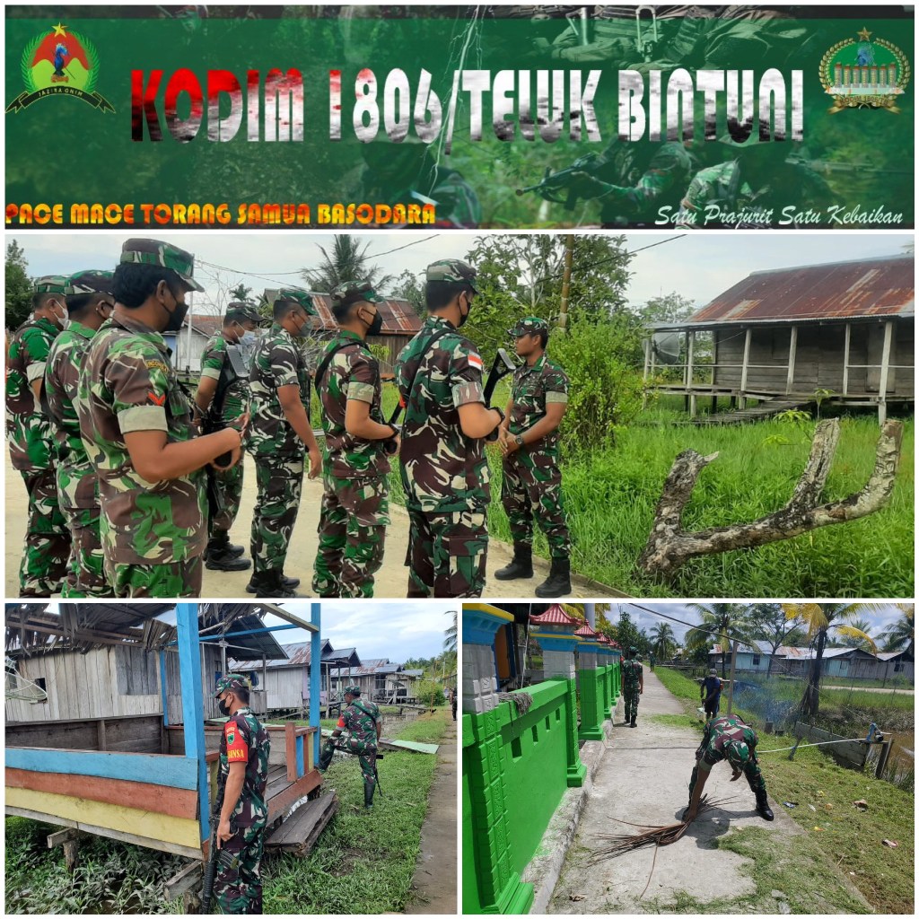 Personel Koramil Persiapan Kamundan melaksanakan kegiatan Karya Bakti membantu pembersihan sektor mesjid Kamundan distrik Kamundan dengan