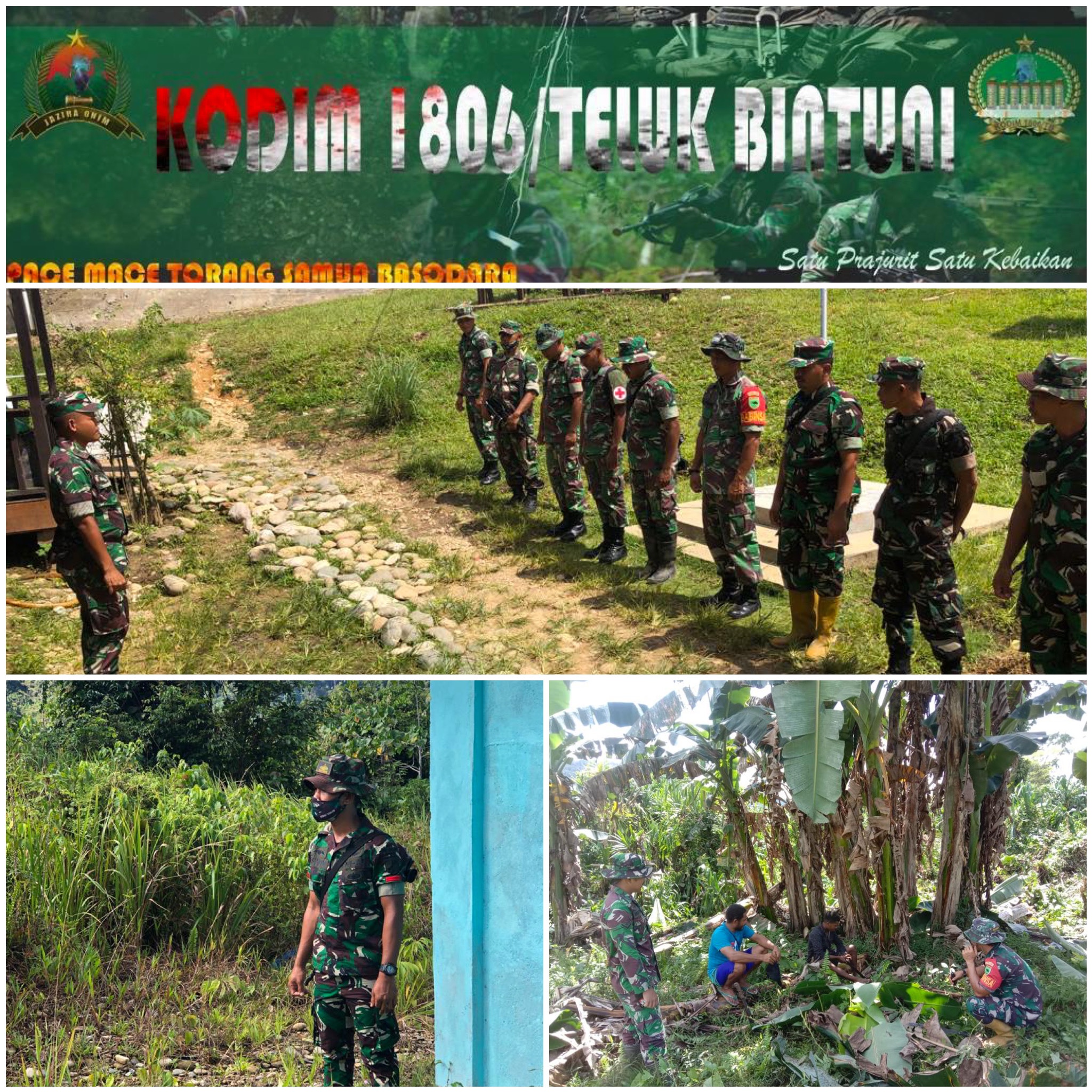 bertempat di kampung Sir, Personel Koramil Persiapan Dataran beimes melaksanakan kegiatan Karya Bakti Pembersihan Balai Kampung Sir Distrik Dataran Beimes.