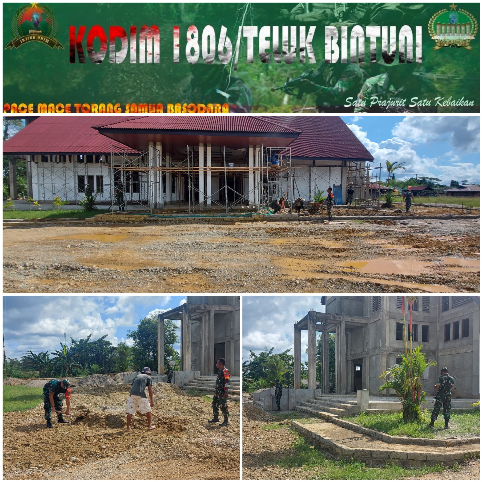 anggota Koramil persiapan Manimeri melaksanakan kegiatan karya bakti di Greja santo lukas bumi saniari sp3