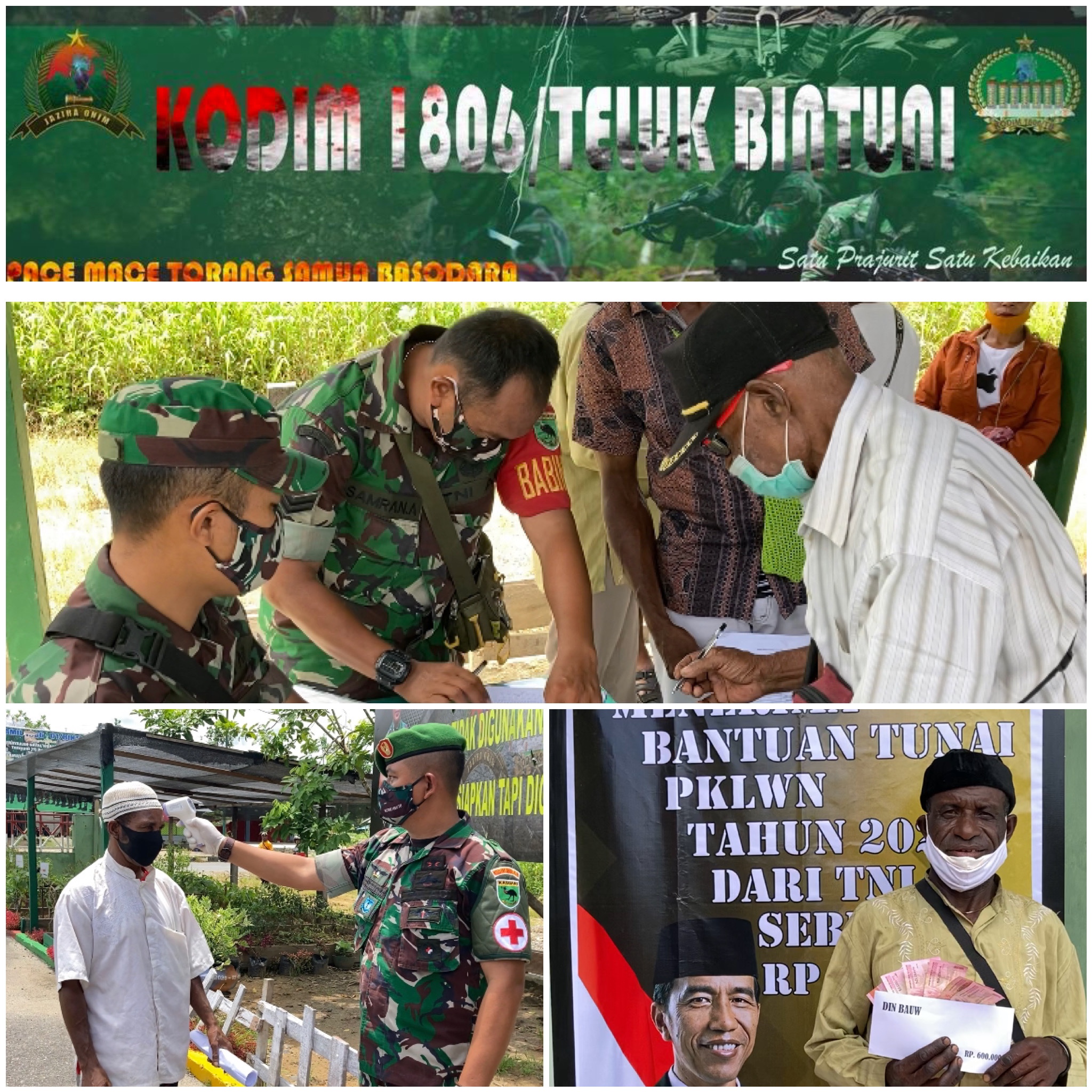 Hari ke-6 Kodim 1806/Teluk Bintuni Korem 182/Jazira Onim menyalurkan Bantuan Tunai sebanyak 600 ribu/orang kepada Pedagang Kaki Lima Warung dan Nelayan (BTPKLWN). Kegiatan penyaluran dilakukan di Koramil1806-01/Bintuni Jalan Trans Bintuni Manokwari , Rabu (13/04/2022