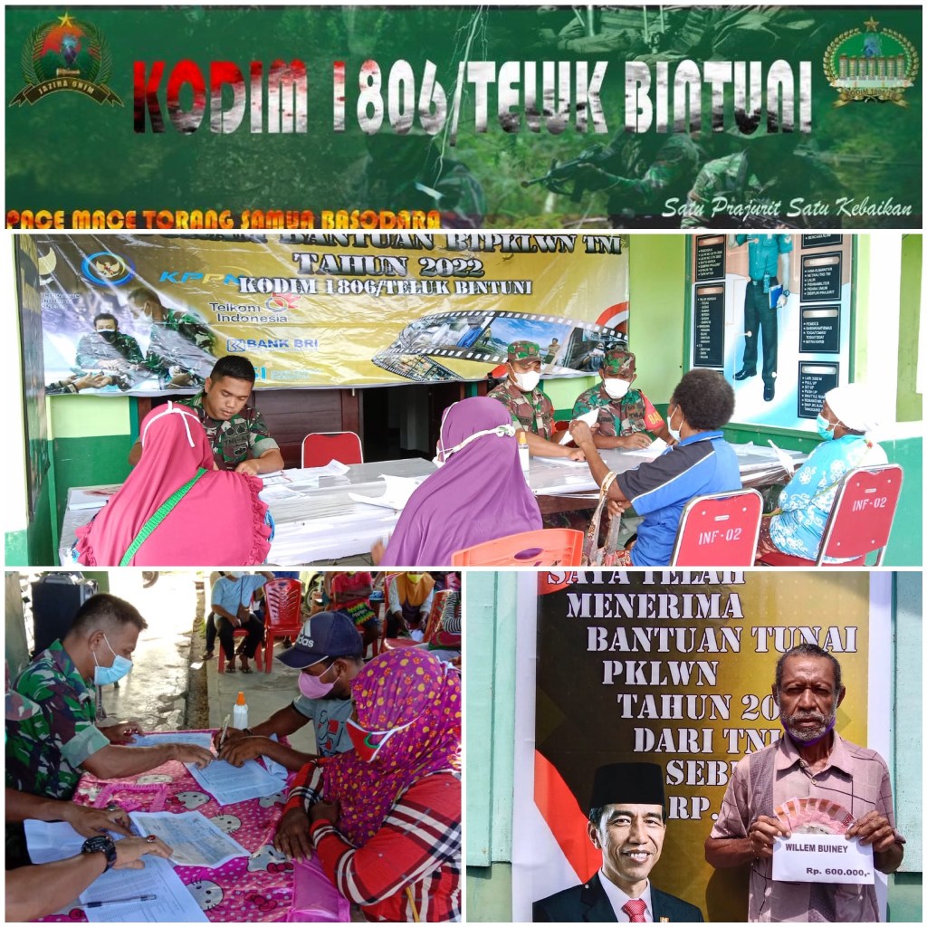 Hari ke-10 Kodim 1806/Teluk Bintuni Korem 182/Jazira Onim menyalurkan Bantuan Tunai sebanyak 600 ribu/orang kepada Pedagang Kaki Lima Warung dan Nelayan (BTPKLWN). Kegiatan penyaluran dilakukan di Koramil1806-01/Bintuni Jalan Trans Bintuni Manokwari , Minggu (16/04/2022Pada hari ini dilaksanakan penyaluran BTPKLWN di wilayah Distrik Bintuni sebanyak 70 orang yang mana masing-masing menerima bantuan dari pemerintah senilai Rp. 600.000,-Kegiatan ini dilaksanakan TNI yang dipercaya oleh pemerintah untuk menyalurkan bantuan langsung pedagang kaki lima, warung dan nelayan kepada masyarakat