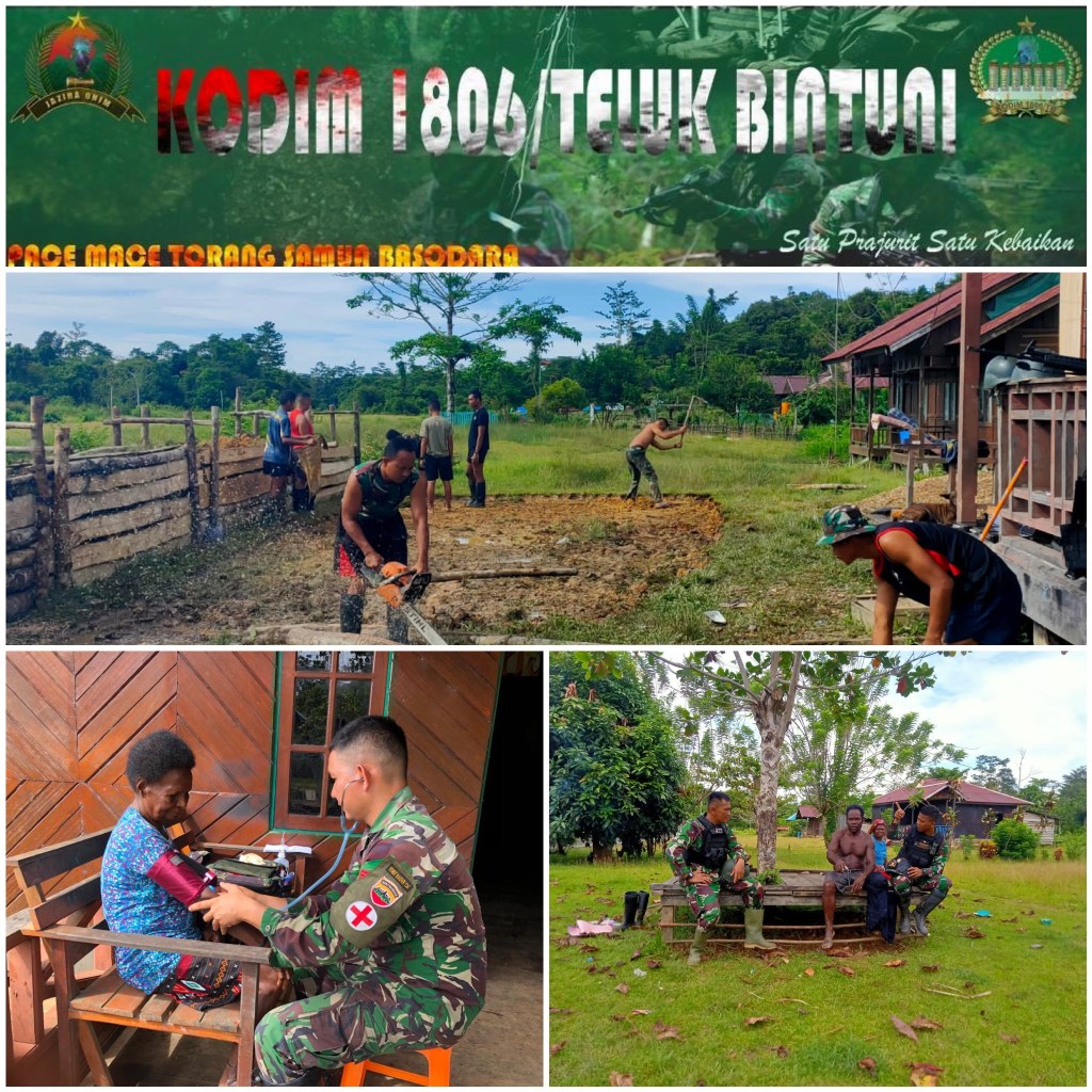 POS PENGAMANAN DISTRIK MEYARGA MELAKSANAKAN PEMBENAHAN PANGKALAN SEKALIGUS KOMUNIKASI SOSIAL.Anggota Pos Meyerga 1806-06/Meyerga Dpp Sertu Agus Suroso melaksanakan Anjang Sana Kerumah bapak Gustinus Orocomna Selaku ( Kepala Kampung ) kampung Maginet Sebagian Personel Melaksanakan pembenahan Pos dan Pengobatan kepada Masyarakat kampung Maginet.
